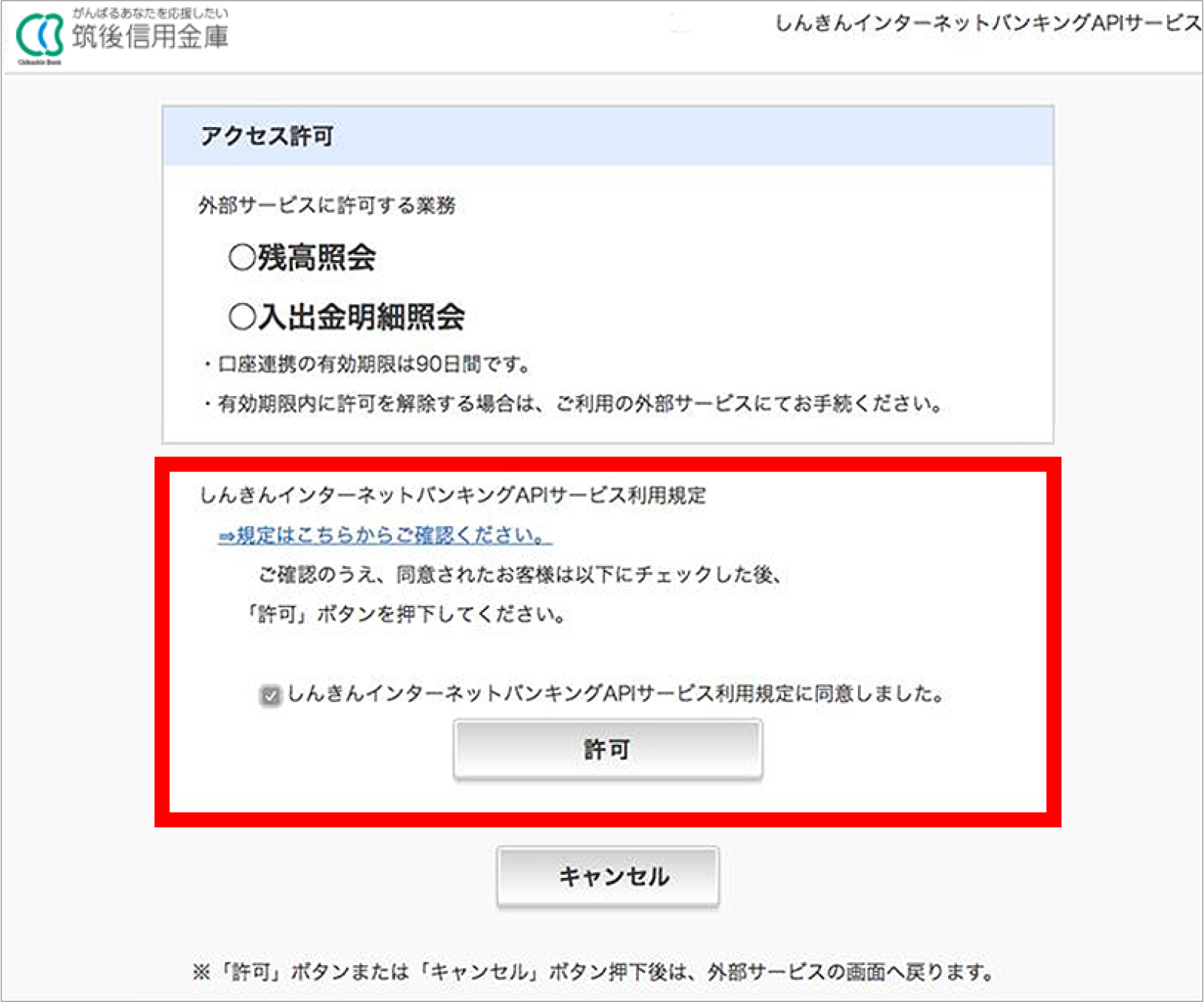 許可する業務・有効期間を確認し、利用規定への同意を行い、アクセスを許可します。