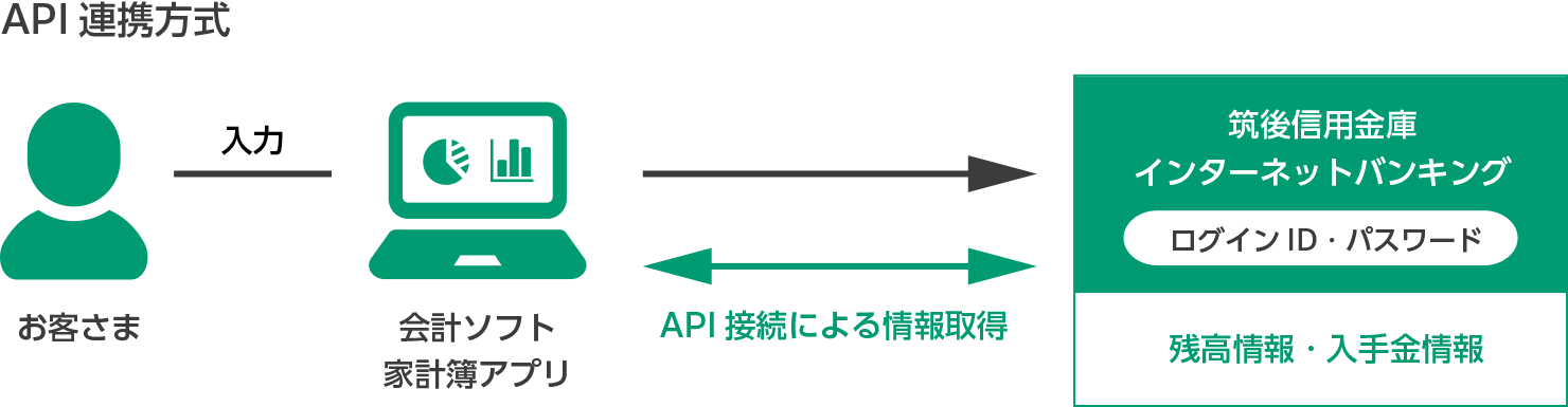 参照系API連携サービスとは、会計ソフト等を利用する際に、ソフト内にインターネットバンキングまたはバンキングアプリのログインID・パスワードを保存することなくインターネットバンキングの残高や入出金明細情報と連携できるサービスです。