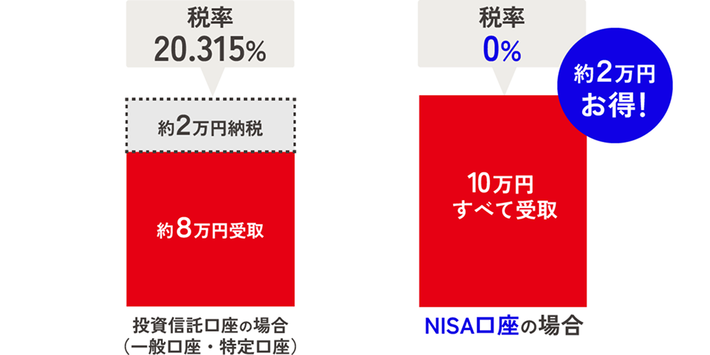 NISA(ニーサ)とは、2014年1月から導入された、「少額投資非課税制度」です。株式投資信託の売却益や分配金が非課税になります。非課税口座(NISA口座)を開設していただくことで、制度の適用を受けることができます。