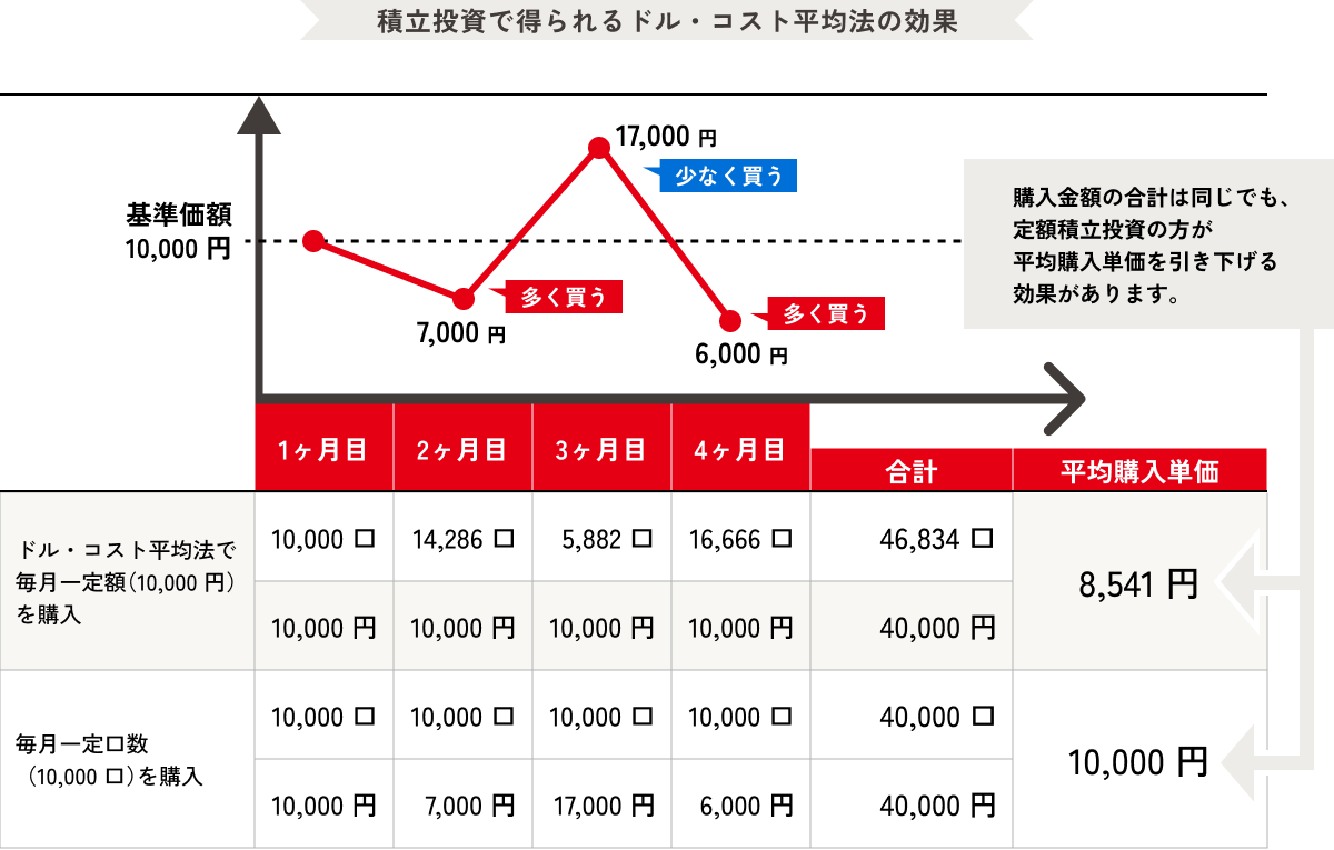 ドル・コスト平均法とは、長期にわたって定期的に一定額で同一の商品の購入を続ける投資方法のことです。基準価額が高いときには購入口数は少なくなり、低い時には購入口数は多くなるため、結果として平均購入単価を平準化させる効果が期待できます。