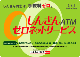 全国の信用金庫ATMをゼロネットサービスタイム中は手数料無料で利用できるサービスです。信用金庫のキャッシュカードをお持ちの場合は、全国約1万7千台のしんきんATMで利用手数料を支払うことなく、現金の引出し・預入れができますので、お取引信用金庫のATMが設置されていない地域でも安心してご利用いただけます。