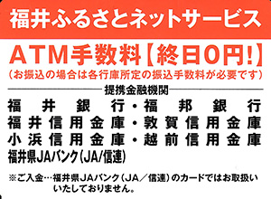 福井県内に本店を置く7金融機関のキャッシュカードは、対象のステッカーのあるATMにて終日手数料無料でご利用いただけます。