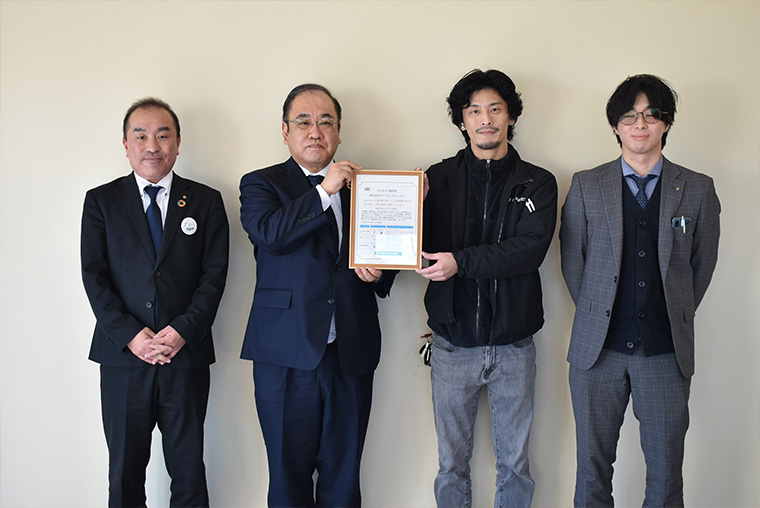 笠谷勝秀総合企画部長と森合支店の五十嵐信行支店長、佐藤遼平係長が同行しました。作成支援件数は今年度3件目、累計で13件目となりました。