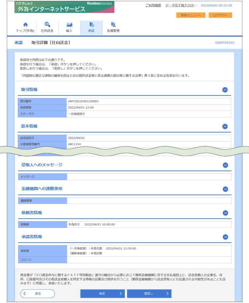 ダブル承認で最終承認者の場合、当金庫へデータ送信されます。