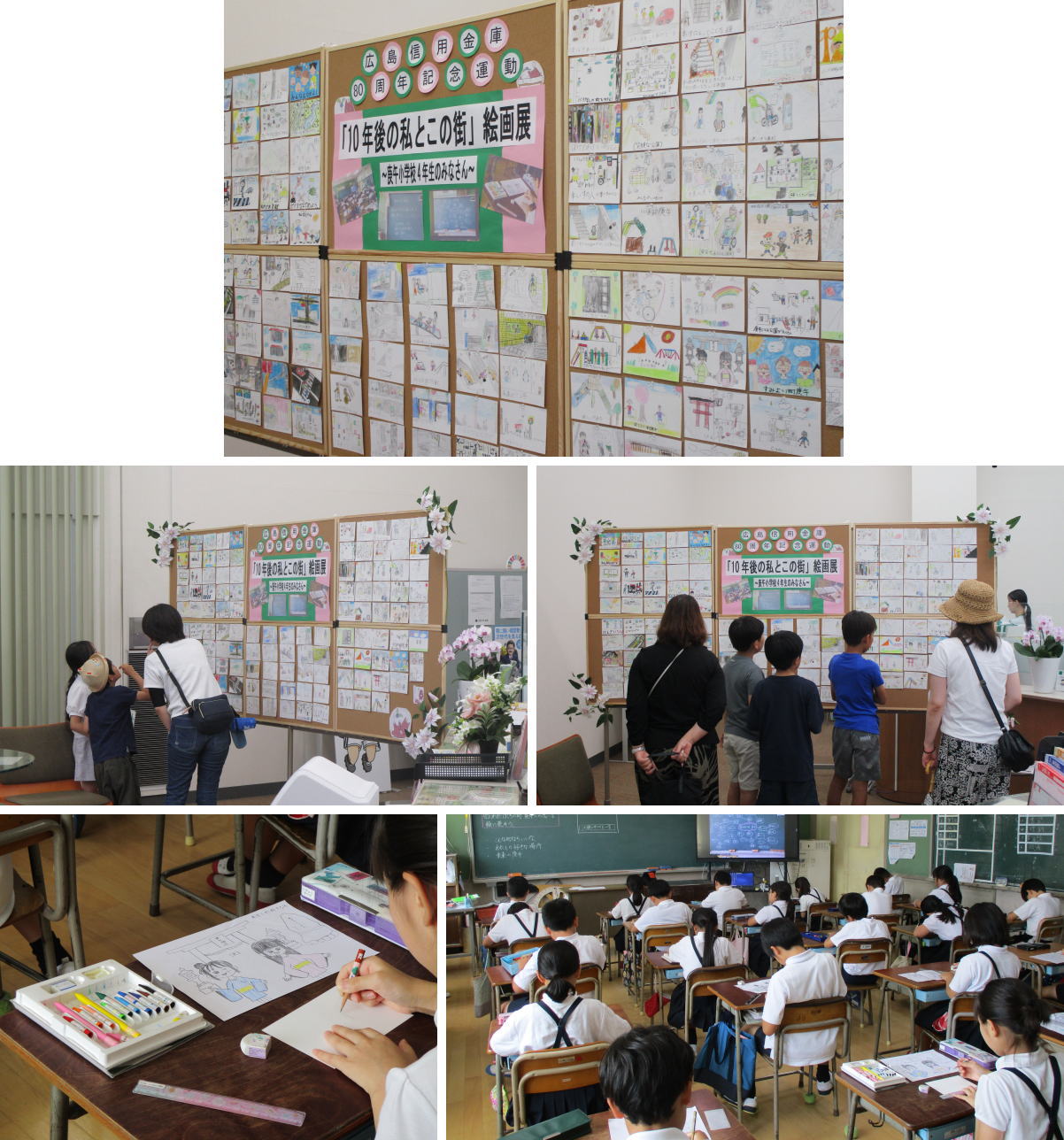庚午小学校4年生は総合の学習の一環として「住よい町 庚午」をテーマにみんなで地域の暮らしについて意見を出し合い、明るく元気に楽しく暮らせる街について考えてくれました。庚午支店では、子供たちが考える明るい未来の庚午地区を地域の皆さんに知っていただくために、子どもたちが考える10年後の庚午の街について絵を描いてもらい、2025年8月1日(金)~8月31日(日)、ロビー展を開催しました。