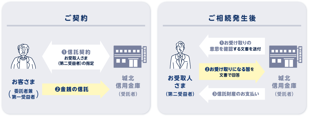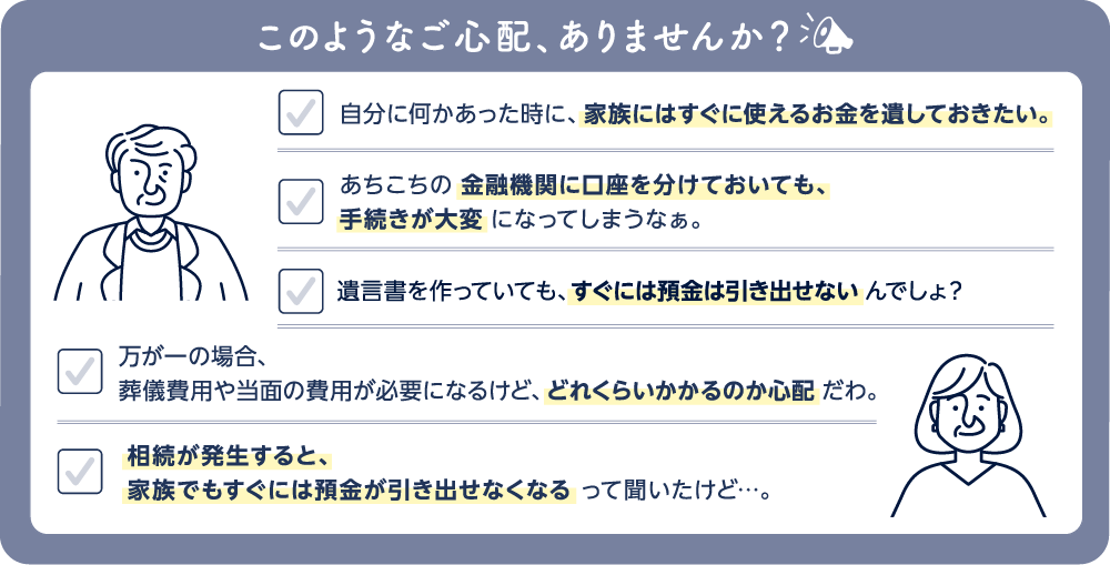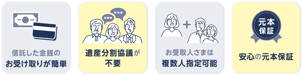 葬儀費用や当面の生活資金などの金銭を、複雑な手続きなしでお渡しできる信託商品です。