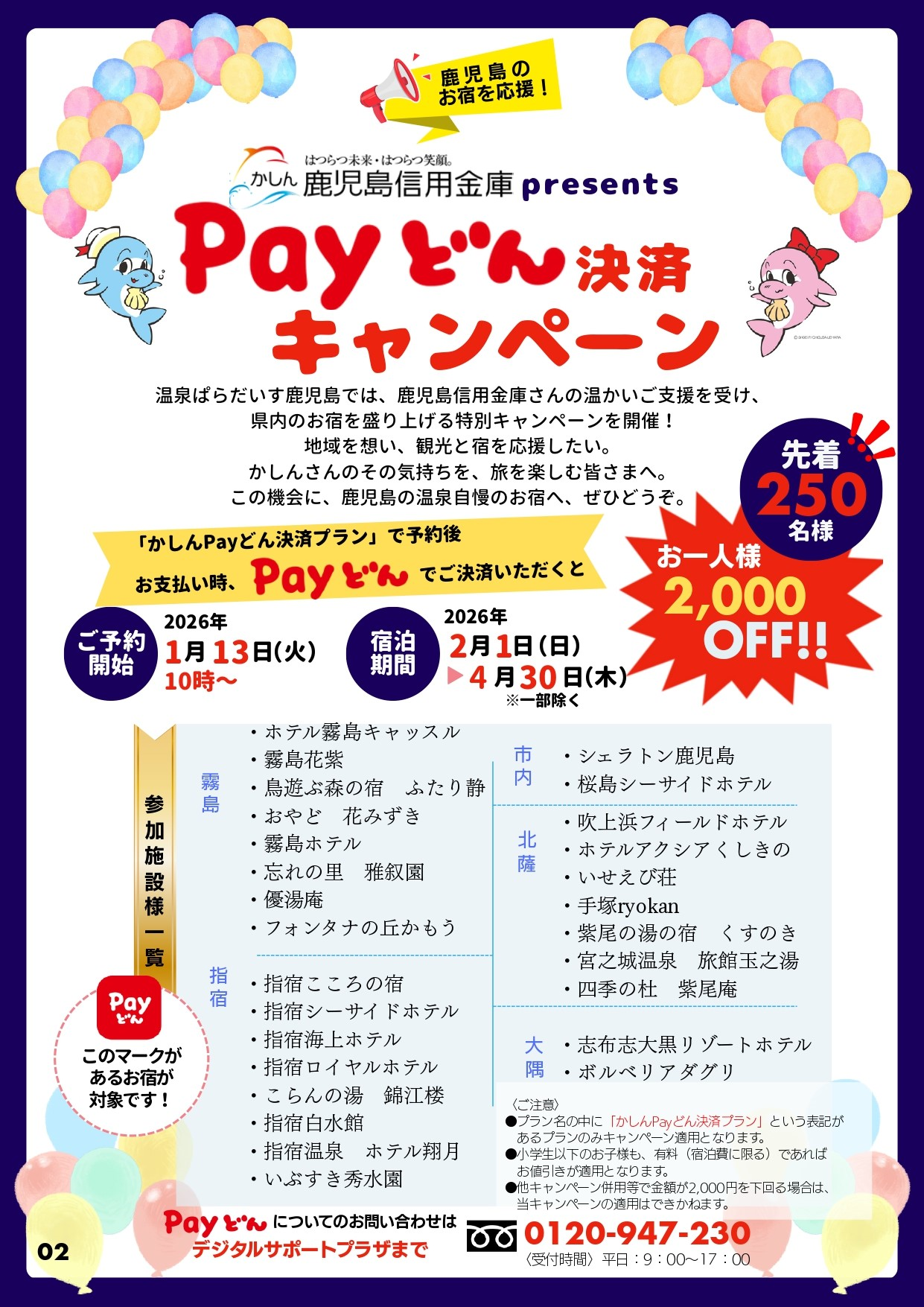 本キャンペーンは、今年度県内で発生した大雨による災害に加え新燃岳の噴火、トカラ列島の群発地震などの自然災害により影響を受けた事業者の皆様を支援するものです。当金庫が募集した寄付型定期預金「がんばろう!かごしま定期預金チェスト」を契機とした取組であり、温泉パラダイス鹿児島様と共同でPayどんを利用した宿泊割引を実施いたします。