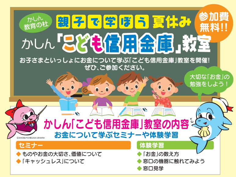 鹿児島信用金庫では、「かしん教育の杜」事業の一環として、夏休みを利用して小学生の皆さまにお金について学んでいただくため ~親子で学ぼう夏休み~ かしん「こども信用金庫」教室を下記のとおり開催します。