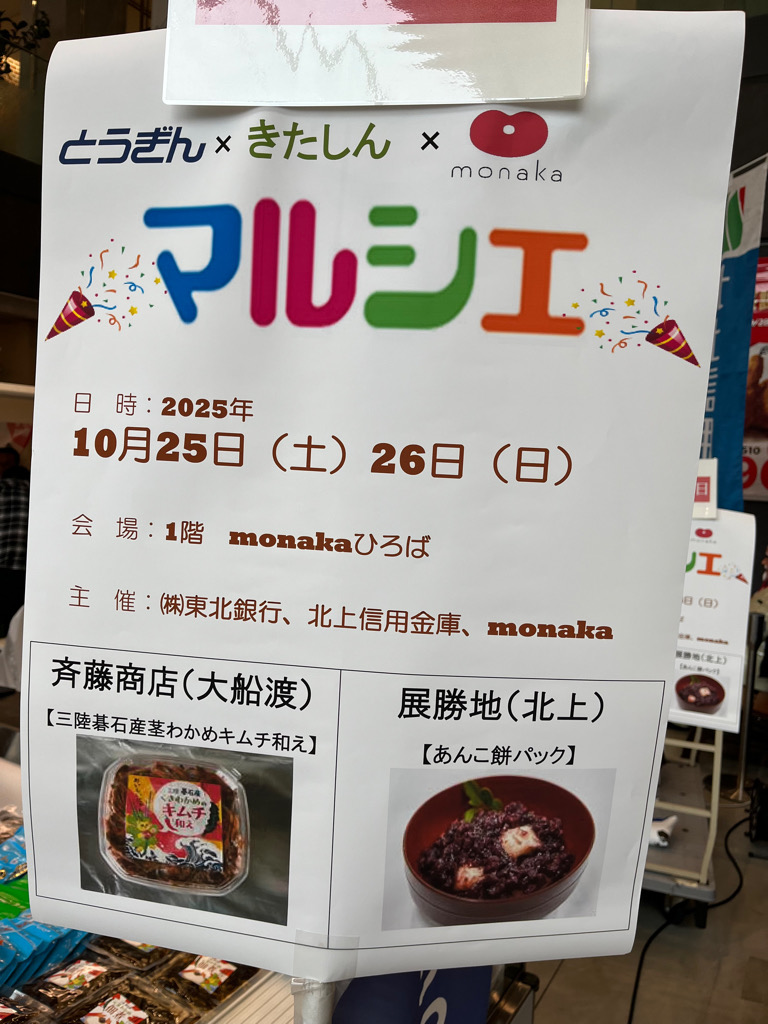 令和7年10月25日(土)、26日(日)に盛岡市の複合商業施設monakaで「とうぎん・きたしん・monaka マルシェ」が開催されました。