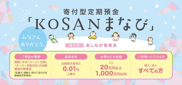 震災で親を亡くされたお子さんが、未来に向かって歩み続けられるように! 預金残高の0.01%を「あしなが育英会」に寄付いたします。 個人・法人すべての方がご利用になれます。