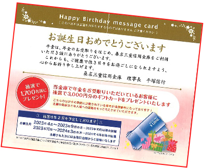 2023年4月から2023年9月に当金庫よりバースデーカードをお送りしたお客さまを対象に、厳正かつ公正に抽選を行い、当選者が決定いたしました。