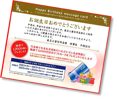 2023年9月から2024年3月に当金庫よりバースデーカードをお送りしたお客さまを対象に、厳正かつ公正に抽選を行い、当選者が決定いたしました。