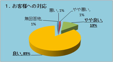 85%のお客様が「良い」、13%のお客様が「やや良い」とご回答下さいました。今後もお客様にご満足いただける対応を心掛けます。