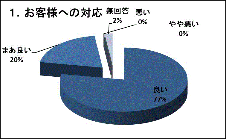 77%のお客様が「良い」、20%のお客様が「まあ良い」とご回答下さいました。今後もお客様にご満足いただける対応を心掛けます。