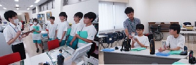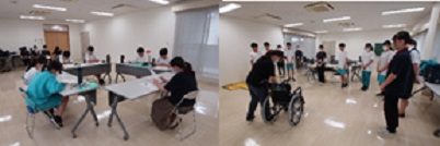 「高齢者疑似体験学習」では、実際に高齢者疑似体験装具を身に着けることで、加齢による体の不自由さを体験し、高齢者へ配慮した適切な対応を学習しました。
