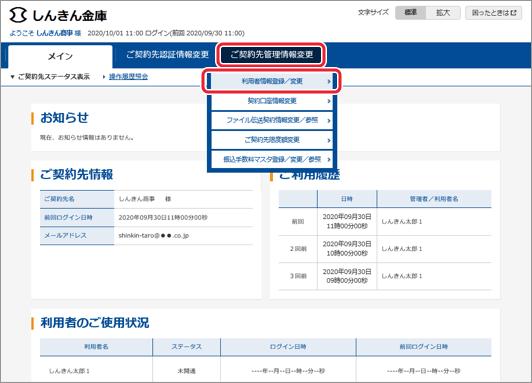 イ.管理者メニュー「ご契約先管理情報変更 → 利用者情報登録/変更」をクリックします。