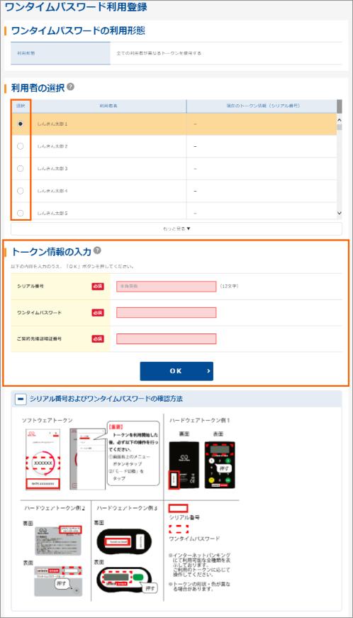 ニ.ワンタイムパスワード利用登録の画面で、トークンを登録する利用者の「選択」欄にチェックを入れ、トークン情報とご契約先確認暗証番号を入力し、OKをクリックします。