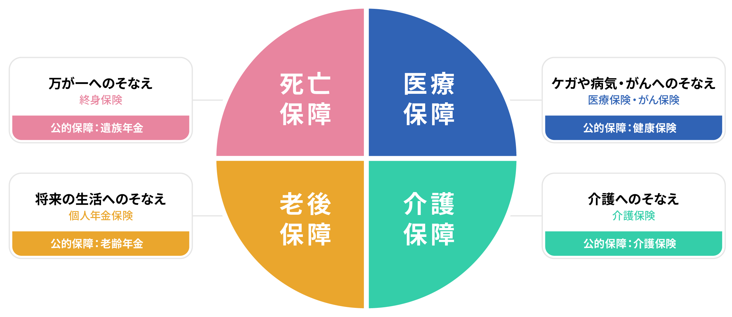 人生に必要な保障は、大きく4つに分けられます。それぞれの保障はご自身の出費を補う方法であり、その間の家族の生活を支える方法でもあります。
