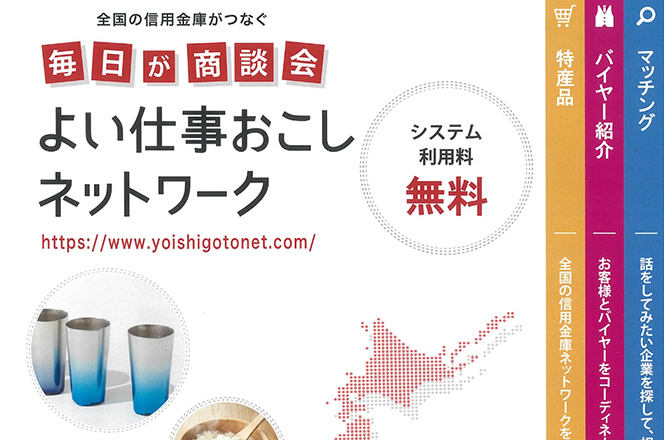全国の信用金庫のお客さまの「売りたい」 「買いたい」「組みたい」「こんなことで困っている」等を信用金庫約7,400 店舗の全国 ネットワーク網を構築し、仲介・解決のお手伝いをするなど、商談等取次ぎサービスを行い中小企業の売上増加や事業の活性化を応援しています。