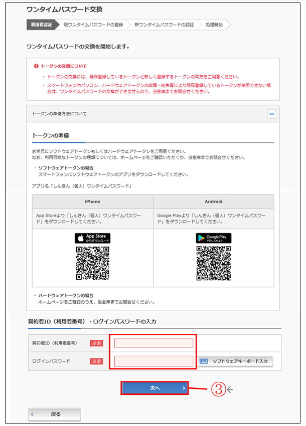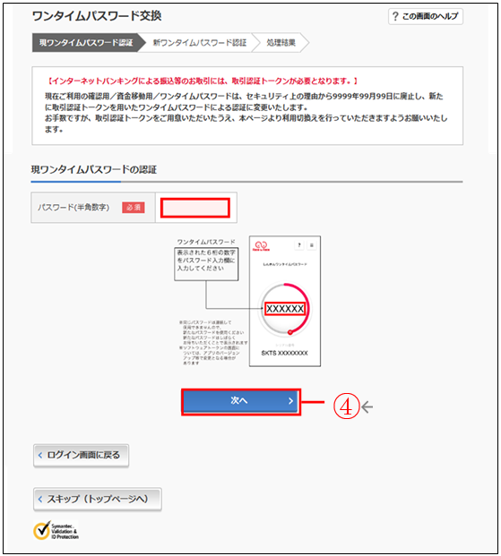 - 4.旧トークン(現在ご利用中のトークン)の「ワンタイムパスワード」を入力する欄が出てくるので、ワンタイムパスワードを入力し、「次へ」ボタンを押す。
