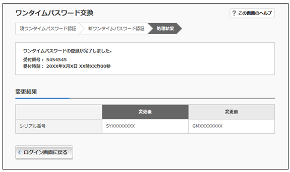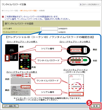 - 5.新しいトークンの「シリアル番号」「ワンタイムパスワード」を入力する欄が出てくるので、それぞれ入力し、「登録」ボタンを押す。
