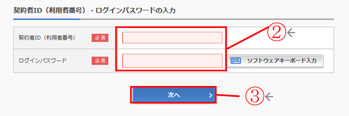 - 2.契約者ID、ログインパスワードを入力する。