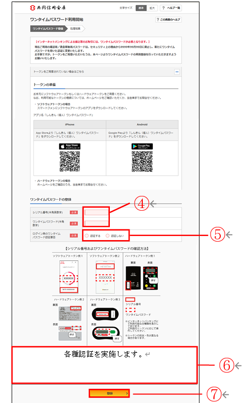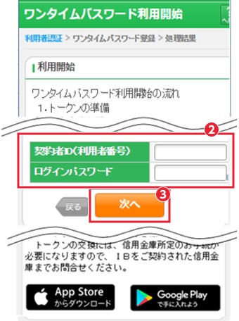 ワンタイムパスワード認証をご利用になるには、ワンタイムパスワードの利用開始操作が必要となります。以下は、信用金庫のインターネットバンキングのログイン画面以降の手順となります。