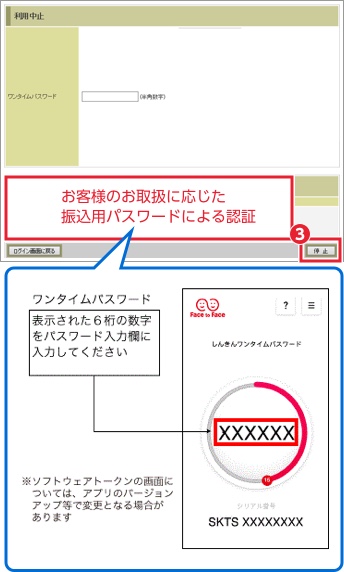 - 3.トークンに表示されるパスワードとお客さまのお取扱に応じた振込用パスワードを入力し、「停止」ボタンを押下する。