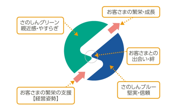 中央の「S」は佐野信用金庫・佐野市のSを表し、上下でSをかたどるグリーンとブルーのツートンカラーは自然に恵まれた当地域の環境を「水と緑」で表します。中央の接近部分は、お客さまとしっかりと手を携えて、ともに将来へ向かって前進する姿勢を象徴するものです。