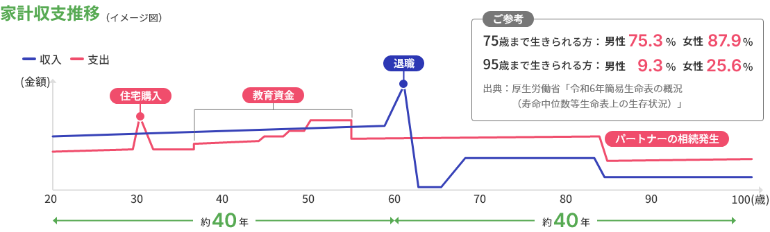 退職前後は収入と支出のバランスが大きく変化し、それまでに蓄えた資産を取り崩して生活していくことになるかもしれません。長生きすることを想定して、早めの準備が必要です。