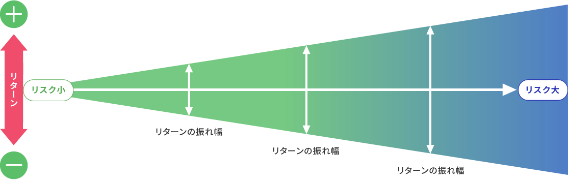 商品によってリスクとリターンの度合いは異なりますが、収益が大きいほど、その収益の振れ幅が大きくなるという傾向があります。このため、一般に、大きなリスクをとれば、損失が大きくなるおそれもありますが、高い収益を期待することができます。