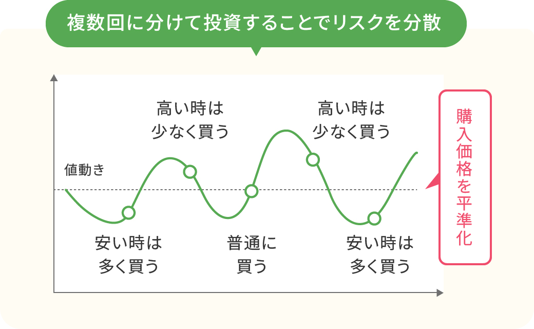 安い時に買って高い時に売るのが理想ではありますが、プロでもなかなかうまくできるものではありません。一度にすべての資金で購入するのではなく、複数回に分けて投資をすることで、高い時に買い過ぎたり、平均購入単価を引き下げ、高値づかみのリスクを低減する効果が期待できます。