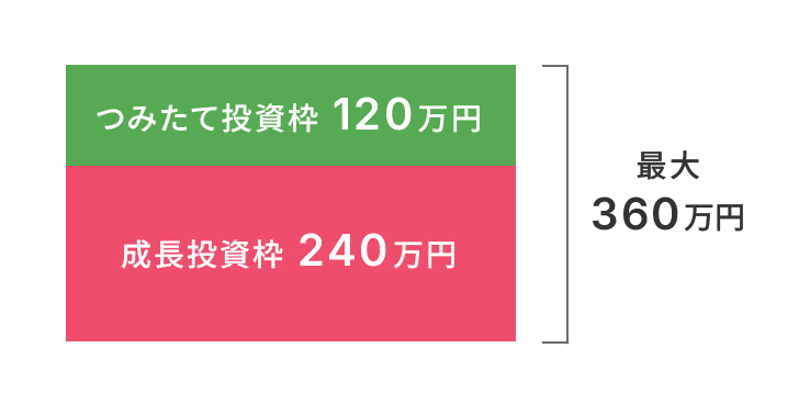年間最大360万円年間投資枠は、つみたて投資枠が120万円、成長投資枠が240万円で、合計年間最大360万円の投資が可能です。