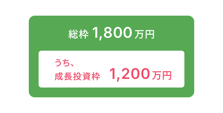 1,800万円一人あたりの投資枠は、1,800万円です。そのうち成長投資枠は1,200万円、1,800万円すべてをつみたて投資枠で利用することも可能です。