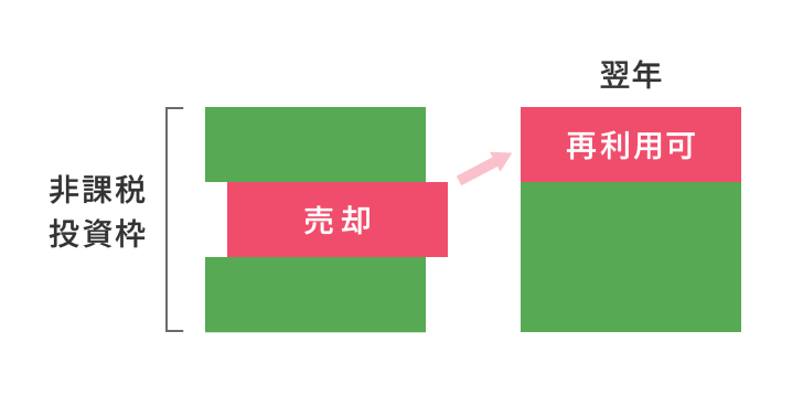 簿価(取得金額)で投資枠の管理を行います。売却分は、翌年以降、再利用することが可能です。