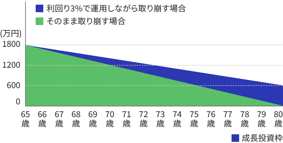 65歳以降、1,800万円を毎年120万円ずつ15年間、利回り3%で運用しながら取り崩す場合