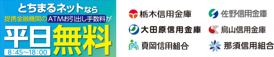 栃木県内に本店を置く7金融機関(大田原信用金庫・栃木信用金庫・佐野信用金庫・烏山信用金庫・足利銀行・真岡信用組合・那須信用組合)は、「とちまるネット」により業務提携を行っています。提携金融機関のお客さまが、提携金融機関のATMを利用して現金のご出金を行う場合、「他行ATM利用手数料」が無料となります。