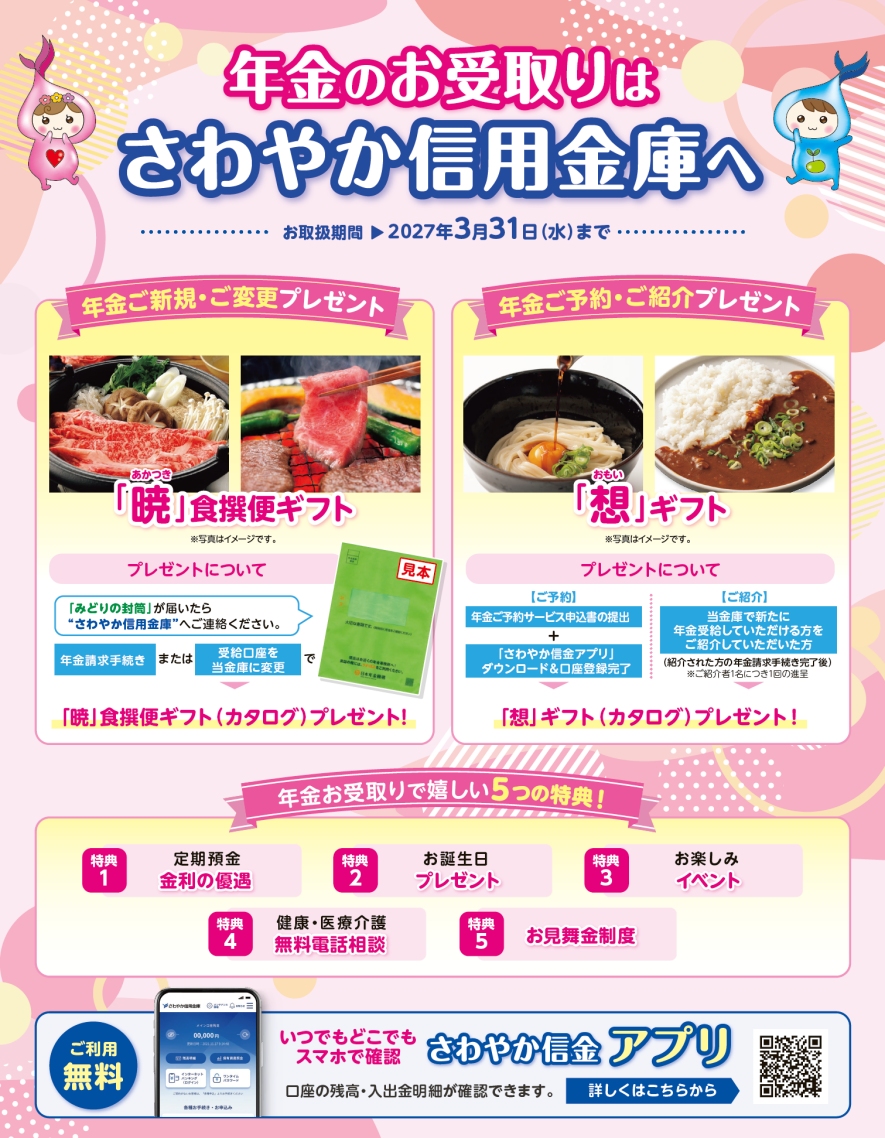 当金庫で年金をお受取りいただきますといろいろな特典があります。