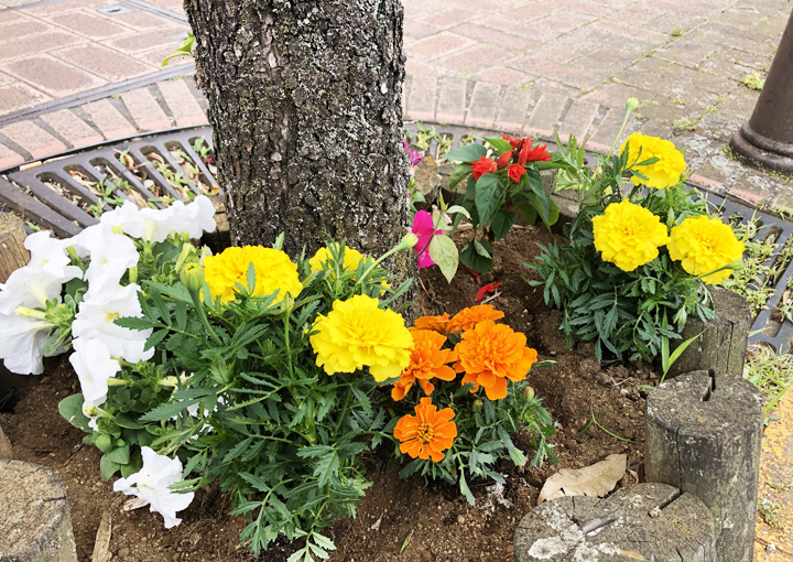 この時期は雑草が多く、まず枯れた草木や雑草を抜いてから新しい花の苗を植えます。マリーゴールドにペチュニア、サルビアといった花壇でおなじみのお花が咲きそろいましたよ。