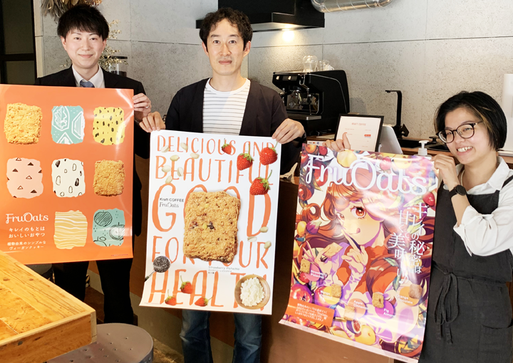 当初カフェのPRポスターをと考えていましたが、推しの「FruOats(フルオーツ)」をメインに学生さんにPRポスターを作成いただきました。辻井代表が選んだ3作品は、クッキーの形をモチーフにしたもの、ドーンとセンターにクッキーの写真を配置したもの、アニメ画なものと3者三様のデザインのPRポスターをお選びいただきました。