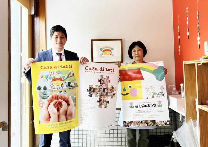 学生さんによる「Casa di tutti(みんなのおうち)」PRポスターは、包み込む手をモチーフにしたもの、パズルのピースをデザインにつながりを表現したもの、