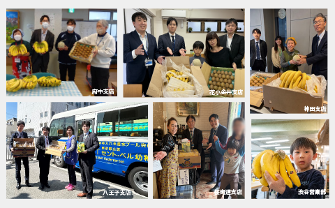 荻窪支店よりお届けした「子ども食堂 おぎよん」(杉並区荻窪)さまでは、フルーツを抱えた職員が登場すると会場は一気に大盛り上がり。