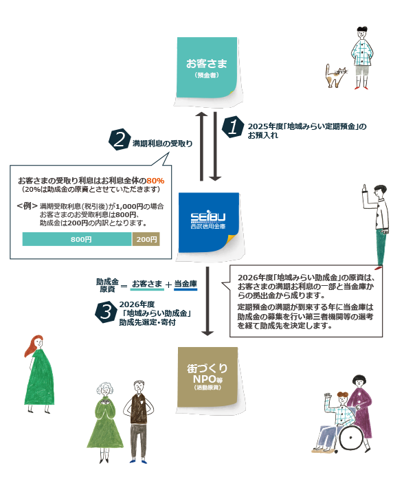 - 初回満期時のみ、税引後利息のうち20%を助成金に、80%を定期預金ご契約時にご指定いただいた利払口座に自動入金させていただきます。