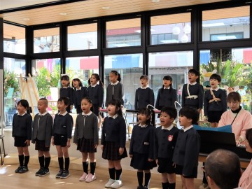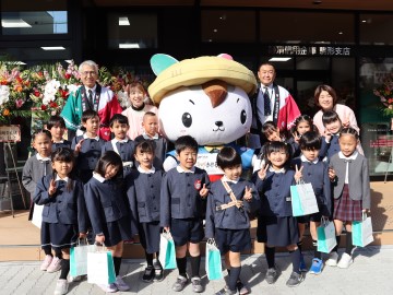 当日は、リニューアルオープンを記念して、当金庫キャラクター「かけるくん」と「きくのちゃん」のお出迎えや、学校法人北條学園こまどり幼稚園の園児のみなさんによる合唱コンサートが開催され、大変盛況を博しました。