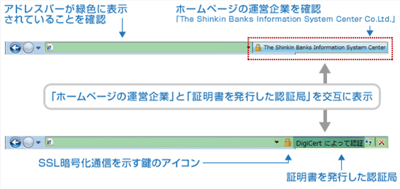 - ※ Internet Explorer 6以前のバージョンのブラウザにより、サイトにアクセスした場合、アドレスバーの色が変化することはありませんが、従来通り、SSL通信は行なわれます。