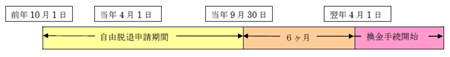 - 持分の全部(出資全額)を譲渡して、会員をやめる場合、譲渡先が見つからなかったときは、当金庫が出資総額の5%に相当する持分を限度として譲り受けさせて頂きますが、その時期につきましては、信用金庫法及び、当金庫の定款に定めた取扱いにより、ご請求日のあった日から(正式の手続きの終了の日とさせていただきます。)6ヶ月を経過した日以降に到来する事業年度末になります。