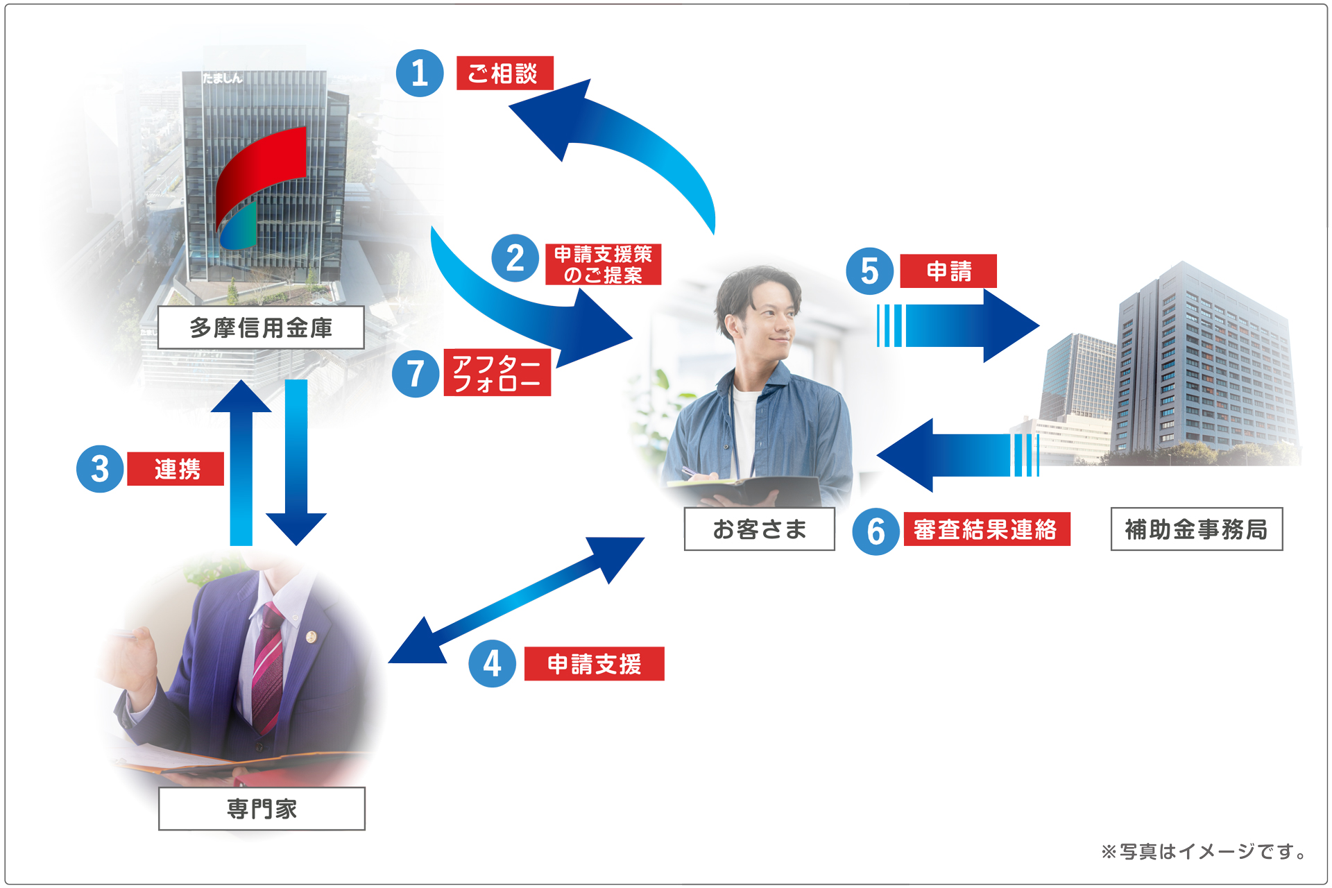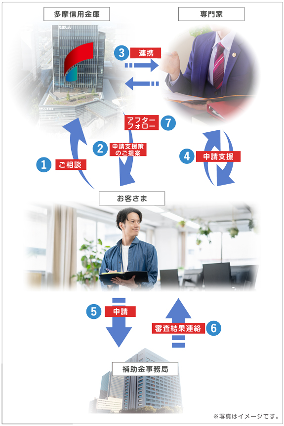 申請支援:専門家がお客さまに申請に関する適切なアドバイス等申請支援を行います