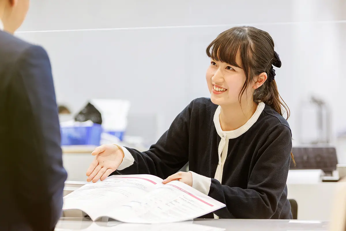 店舗窓口で、お客さまをお迎えするのが窓口業務。おもてなしの心で、お客さまのニーズにお応えします。とうしんの「顔」として、笑顔と親しみやすさを大切にしています。
