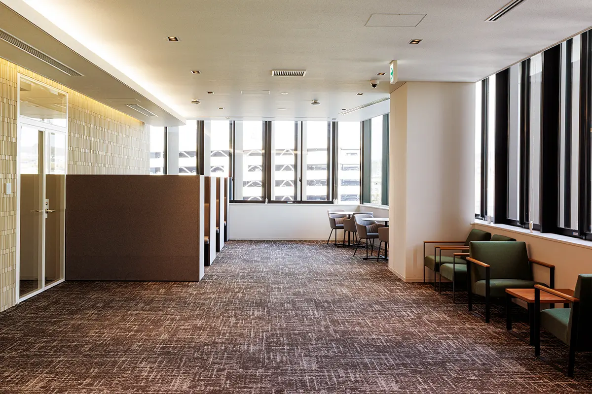 応接室前に位置する打合せスペースです。気軽な打ち合わせから落ち着いた商談まで対応できるよう、区切りのあるスペースを備えた機能的な空間になっております。