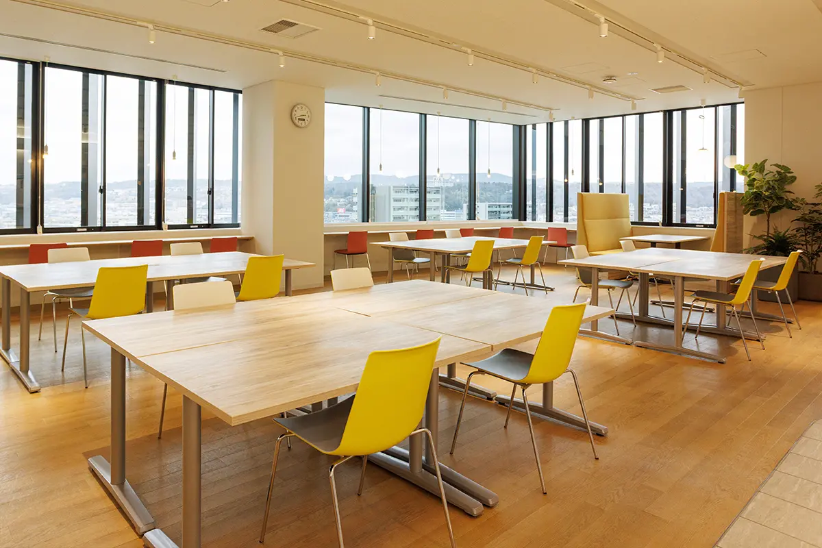 毎日忙しく働いている職員のために、食堂では美味しい日替わりランチを提供しています。広々とした空間には、景色を楽しめるカウンター席やソファを設置しており、職員の憩いの場となっております。